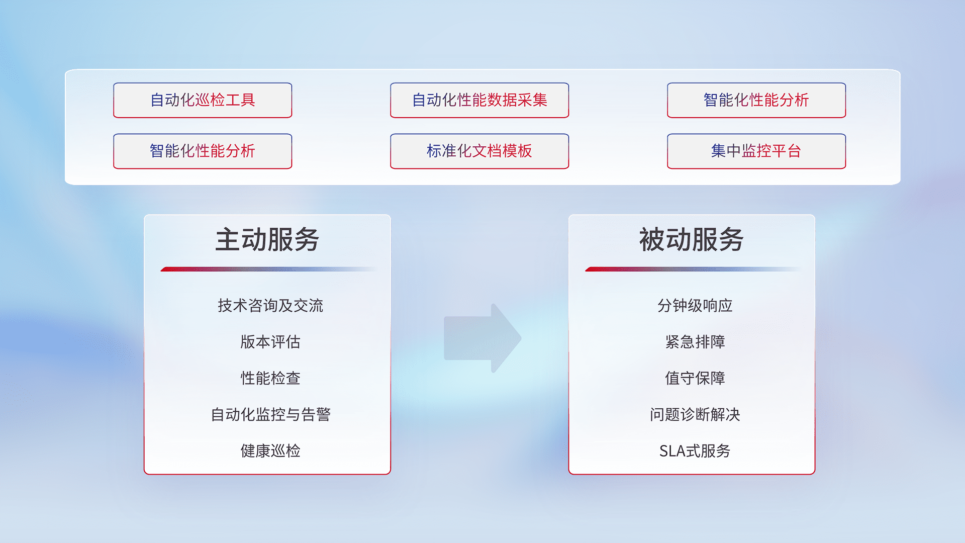 智能化工具和标准化文档,,保障服务质量,,,提供主动服务(包含技术咨询、、、、版本评估、、、、性能检查、、、、自动化监控与告警、、、、健康巡检)和被动服务包含(分钟级响应、、紧急排障、、、、值守保障、、问题诊断解决、、、SLA服务)。。。。